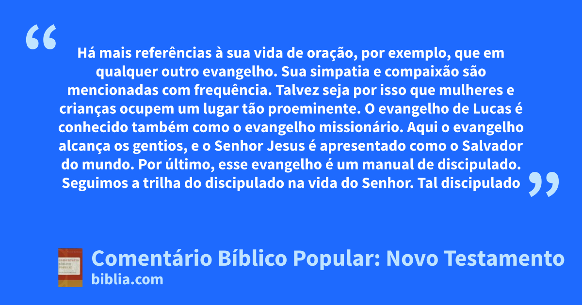 Há mais referências à sua vida de oração, por exemplo, que em qualquer outro evangelho. Sua simpatia e compaixão são mencionadas com frequência. Talvez seja por isso que mulheres e crianças ocupem um lugar tão proeminente. O evangelho de Lucas é conhecido também como o evangelho missionário. Aqui o evangelho alcança os gentios, e o Senhor Jesus é apresentado como o Salvador do mundo. Por último, esse evangelho é um manual de discipulado. Seguimos a trilha do discipulado na vida do Senhor. Tal discipulado