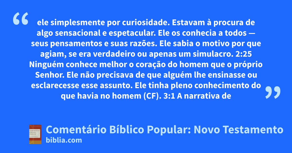 ele simplesmente por curiosidade. Estavam à procura de algo sensacional e espetacular. Ele os conhecia a todos — seus pensamentos e suas razões. Ele sabia o motivo por que agiam, se era verdadeiro ou apenas um simulacro. 2:25 Ninguém conhece melhor o coração do homem que o próprio Senhor. Ele não precisava de que alguém lhe ensinasse ou esclarecesse esse assunto. Ele tinha pleno conhecimento do que havia no homem (CF). 3:1 A narrativa de