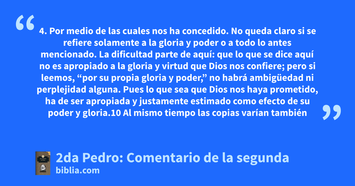 4. Por medio de las cuales nos ha concedido. No queda claro si se refiere solamente a la gloria y poder o a todo lo antes mencionado. La dificultad parte de aquí: que lo que se dice aquí no es apropiado a la gloria y virtud que Dios nos confiere; pero si leemos, “por su propia gloria y poder,” no habrá ambigüedad ni perplejidad alguna. Pues lo que sea que Dios nos haya prometido, ha de ser apropiada y justamente estimado como efecto de su poder y gloria.10 Al mismo tiempo las copias varían también