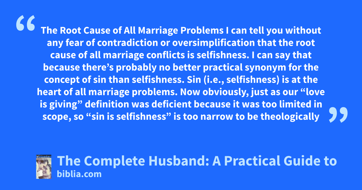 The Root Cause of All Marriage Problems I can tell you without any fear of contradiction or oversimplification that the root cause of all marriage conflicts is selfishness. I can say that because there’s probably no better practical synonym for the concept of sin than selfishness. Sin (i.e., selfishness) is at the heart of all marriage problems. Now obviously, just as our “love is giving” definition was deficient because it was too limited in scope, so “sin is selfishness” is too narrow to be theologically