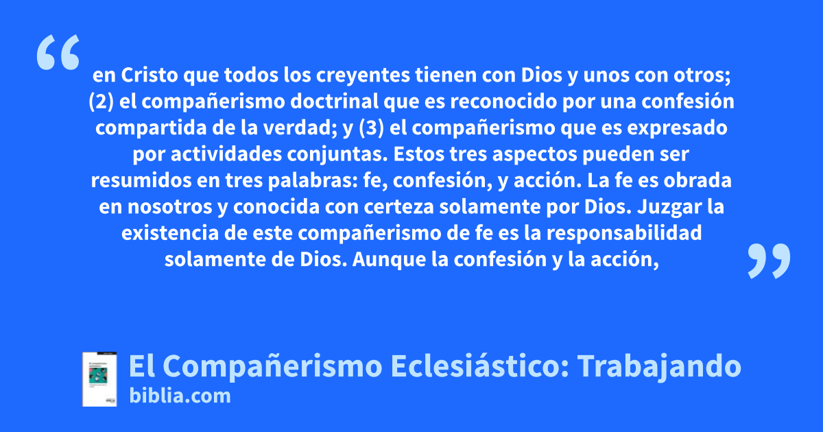 en Cristo que todos los creyentes tienen con Dios y unos con otros; (2) el compañerismo doctrinal que es reconocido por una confesión compartida de la verdad; y (3) el compañerismo que es expresado por actividades conjuntas. Estos tres aspectos pueden ser resumidos en tres palabras: fe, confesión, y acción. La fe es obrada en nosotros y conocida con certeza solamente por Dios. Juzgar la existencia de este compañerismo de fe es la responsabilidad solamente de Dios. Aunque la confesión y la acción,