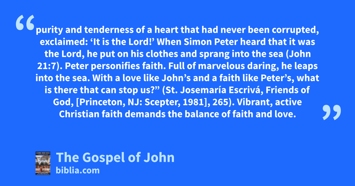 purity and tenderness of a heart that had never been corrupted, exclaimed: ‘It is the Lord!’ When Simon Peter heard that it was the Lord, he put on his clothes and sprang into the sea (John 21:7). Peter personifies faith. Full of marvelous daring, he leaps into the sea. With a love like John’s and a faith like Peter’s, what is there that can stop us?” (St. Josemaría Escrivá, Friends of God, [Princeton, NJ: Scepter, 1981], 265). Vibrant, active Christian faith demands the balance of faith and love.