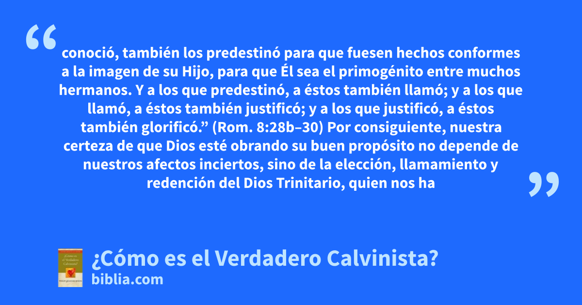 conoció, también los predestinó para que fuesen hechos conformes a la imagen de su Hijo, para que Él sea el primogénito entre muchos hermanos. Y a los que predestinó, a éstos también llamó; y a los que llamó, a éstos también justificó; y a los que justificó, a éstos también glorificó.” (Rom. 8:28b–30) Por consiguiente, nuestra certeza de que Dios esté obrando su buen propósito no depende de nuestros afectos inciertos, sino de la elección, llamamiento y redención del Dios Trinitario, quien nos ha
