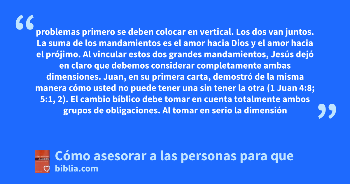 problemas primero se deben colocar en vertical. Los dos van juntos. La suma de los mandamientos es el amor hacia Dios y el amor hacia el prójimo. Al vincular estos dos grandes mandamientos, Jesús dejó en claro que debemos considerar completamente ambas dimensiones. Juan, en su primera carta, demostró de la misma manera cómo usted no puede tener una sin tener la otra (1 Juan 4:8; 5:1, 2). El cambio bíblico debe tomar en cuenta totalmente ambos grupos de obligaciones. Al tomar en serio la dimensión