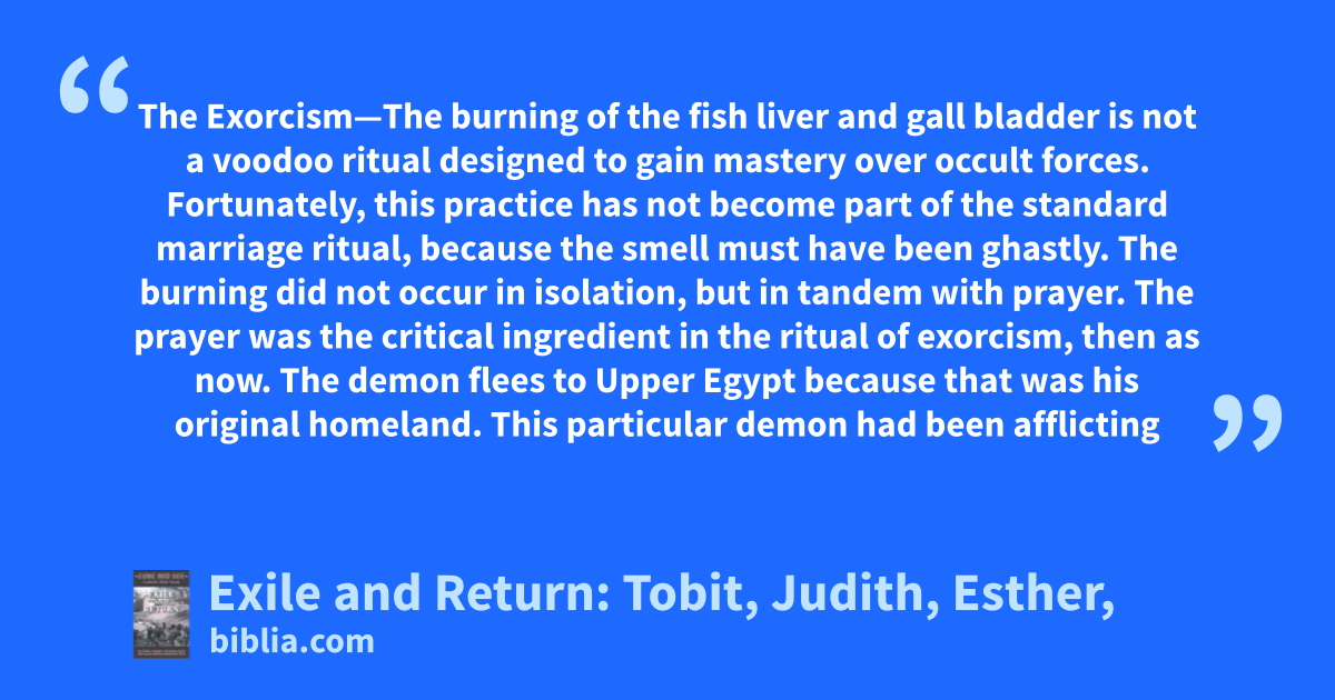 The Exorcism—The burning of the fish liver and gall bladder is not a voodoo ritual designed to gain mastery over occult forces. Fortunately, this practice has not become part of the standard marriage ritual, because the smell must have been ghastly. The burning did not occur in isolation, but in tandem with prayer. The prayer was the critical ingredient in the ritual of exorcism, then as now. The demon flees to Upper Egypt because that was his original homeland. This particular demon had been afflicting