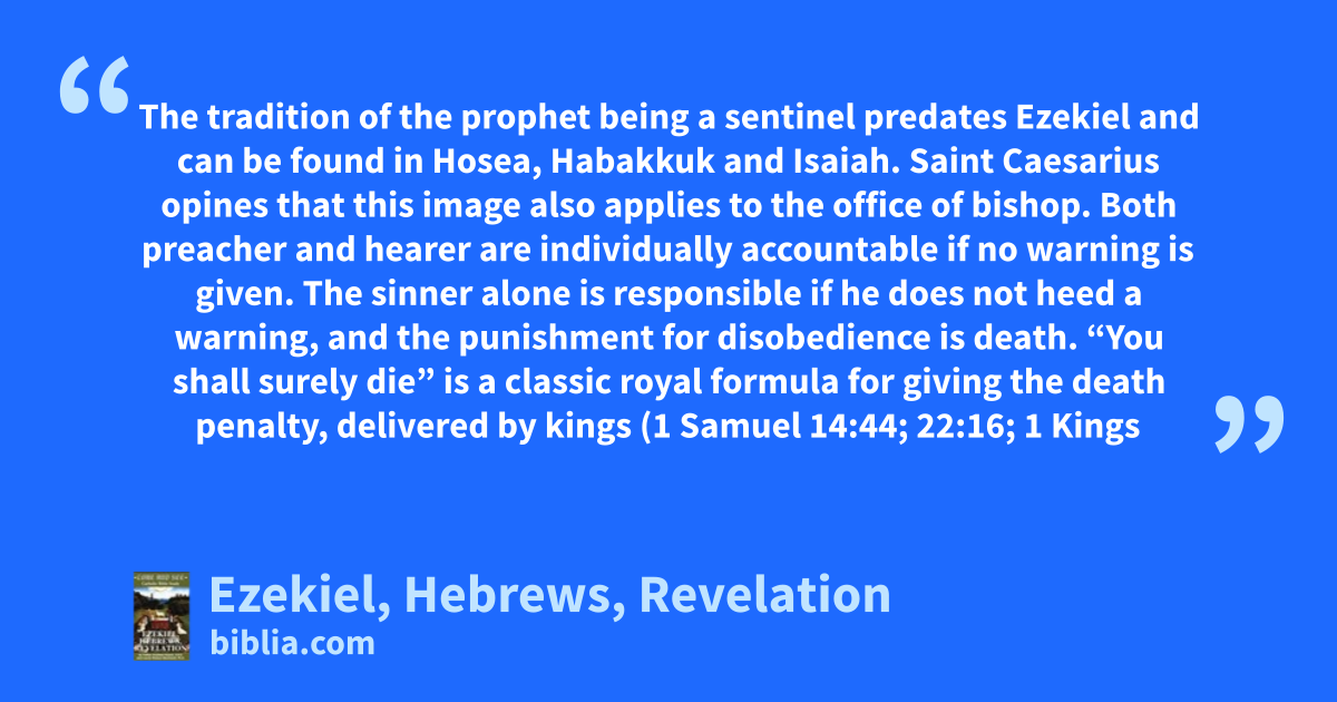 The tradition of the prophet being a sentinel predates Ezekiel and can be found in Hosea, Habakkuk and Isaiah. Saint Caesarius opines that this image also applies to the office of bishop. Both preacher and hearer are individually accountable if no warning is given. The sinner alone is responsible if he does not heed a warning, and the punishment for disobedience is death. “You shall surely die” is a classic royal formula for giving the death penalty, delivered by kings (1 Samuel 14:44; 22:16; 1 Kings