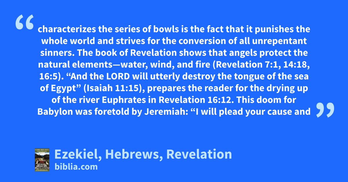characterizes the series of bowls is the fact that it punishes the whole world and strives for the conversion of all unrepentant sinners. The book of Revelation shows that angels protect the natural elements—water, wind, and fire (Revelation 7:1, 14:18, 16:5). “And the LORD will utterly destroy the tongue of the sea of Egypt” (Isaiah 11:15), prepares the reader for the drying up of the river Euphrates in Revelation 16:12. This doom for Babylon was foretold by Jeremiah: “I will plead your cause and