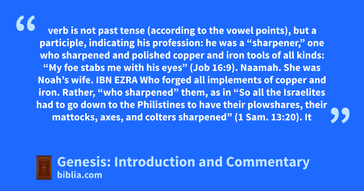 verb is not past tense (according to the vowel points), but a participle, indicating his profession: he was a “sharpener,” one who sharpened and polished copper and iron tools of all kinds: “My foe stabs me with his eyes” (Job 16:9). Naamah. She was Noah’s wife. IBN EZRA Who forged all implements of copper and iron. Rather, “who sharpened” them, as in “So all the Israelites had to go down to the Philistines to have their plowshares, their mattocks, axes, and colters sharpened” (1 Sam. 13:20). It