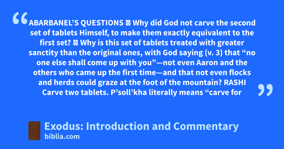 ABARBANEL’S QUESTIONS ♦ Why did God not carve the second set of tablets Himself, to make them exactly equivalent to the first set? ♦ Why is this set of tablets treated with greater sanctity than the original ones, with God saying (v. 3) that “no one else shall come up with you”—not even Aaron and the others who came up the first time—and that not even flocks and herds could graze at the foot of the mountain? RASHI Carve two tablets. P’soll’kha literally means “carve for