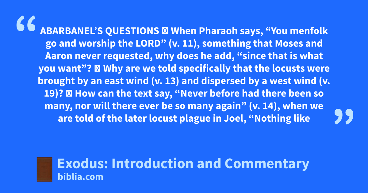 ABARBANEL’S QUESTIONS ♦ When Pharaoh says, “You menfolk go and worship the LORD” (v. 11), something that Moses and Aaron never requested, why does he add, “since that is what you want”? ♦ Why are we told specifically that the locusts were brought by an east wind (v. 13) and dispersed by a west wind (v. 19)? ♦ How can the text say, “Never before had there been so many, nor will there ever be so many again” (v. 14), when we are told of the later locust plague in Joel, “Nothing like