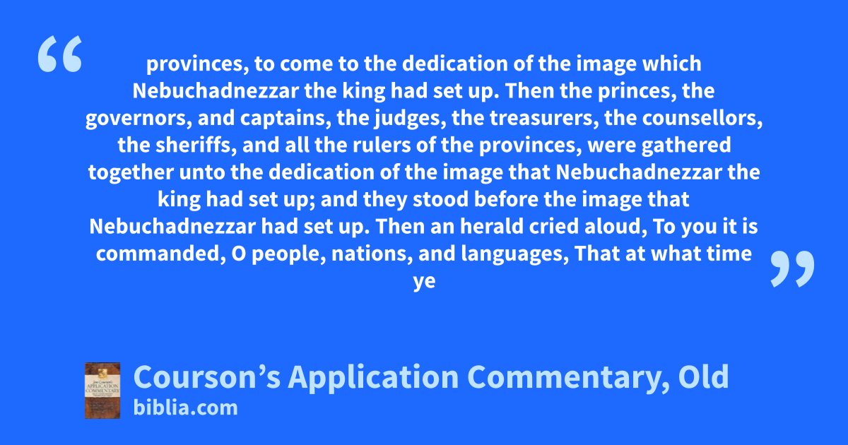 provinces, to come to the dedication of the image which Nebuchadnezzar the king had set up. Then the princes, the governors, and captains, the judges, the treasurers, the counsellors, the sheriffs, and all the rulers of the provinces, were gathered together unto the dedication of the image that Nebuchadnezzar the king had set up; and they stood before the image that Nebuchadnezzar had set up. Then an herald cried aloud, To you it is commanded, O people, nations, and languages, That at what time ye