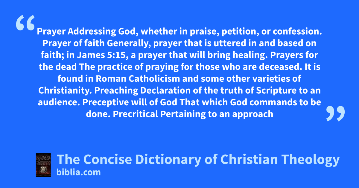 Prayer Addressing God, whether in praise, petition, or confession. Prayer of faith Generally, prayer that is uttered in and based on faith; in James 5:15, a prayer that will bring healing. Prayers for the dead The practice of praying for those who are deceased. It is found in Roman Catholicism and some other varieties of Christianity. Preaching Declaration of the truth of Scripture to an audience. Preceptive will of God That which God commands to be done. Precritical Pertaining to an approach