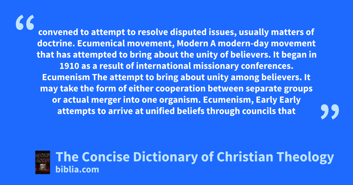 convened to attempt to resolve disputed issues, usually matters of doctrine. Ecumenical movement, Modern A modern-day movement that has attempted to bring about the unity of believers. It began in 1910 as a result of international missionary conferences. Ecumenism The attempt to bring about unity among believers. It may take the form of either cooperation between separate groups or actual merger into one organism. Ecumenism, Early Early attempts to arrive at unified beliefs through councils that