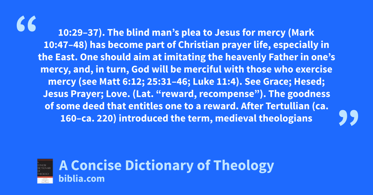 10:29–37). The blind man’s plea to Jesus for mercy (Mark 10:47–48) has become part of Christian prayer life, especially in the East. One should aim at imitating the heavenly Father in one’s mercy, and, in turn, God will be merciful with those who exercise mercy (see Matt 6:12; 25:31–46; Luke 11:4). See Grace; Hesed; Jesus Prayer; Love. (Lat. “reward, recompense”). The goodness of some deed that entitles one to a reward. After Tertullian (ca. 160–ca. 220) introduced the term, medieval theologians