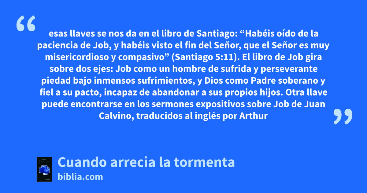 esas llaves se nos da en el libro de Santiago: “Habéis oído de la paciencia de Job, y habéis visto el fin del Señor, que el Señor es muy misericordioso y compasivo” (Santiago 5:11). El libro de Job gira sobre dos ejes: Job como un hombre de sufrida y perseverante piedad bajo inmensos sufrimientos, y Dios como Padre soberano y fiel a su pacto, incapaz de abandonar a sus propios hijos. Otra llave puede encontrarse en los sermones expositivos sobre Job de Juan Calvino, traducidos al inglés por Arthur