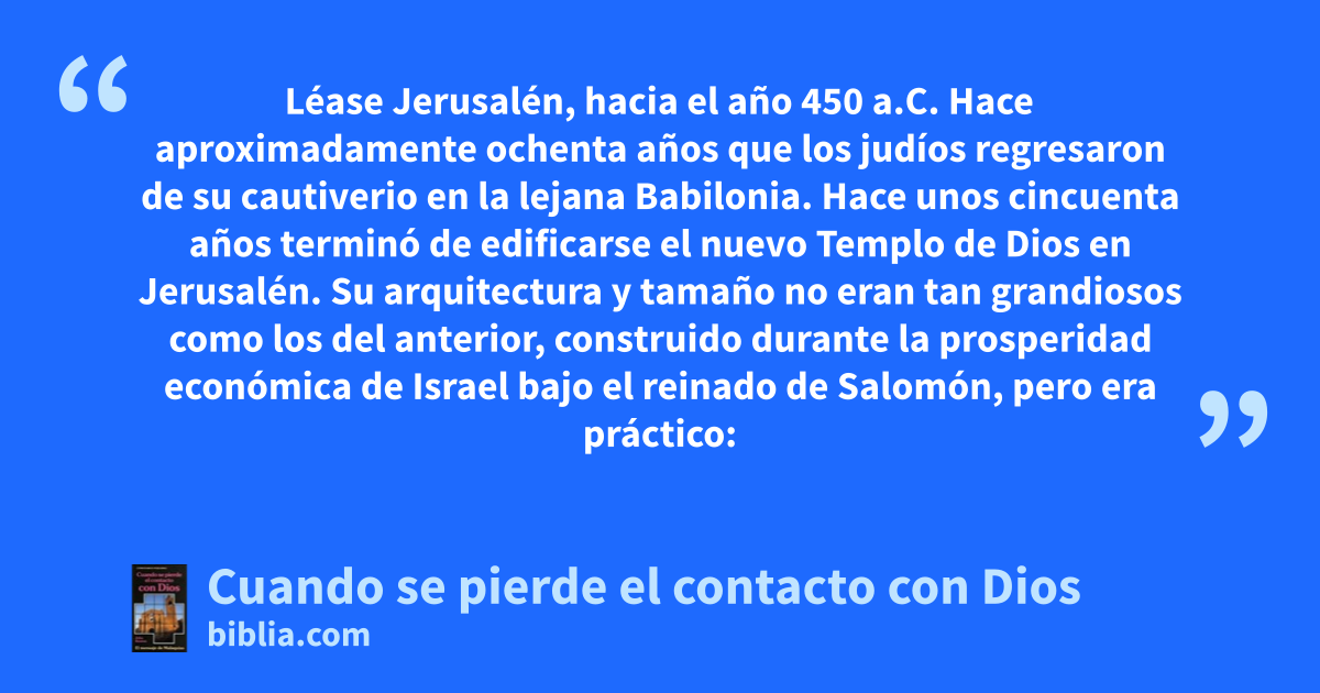 Léase Jerusalén, hacia el año 450 a.C. Hace aproximadamente ochenta años que los judíos regresaron de su cautiverio en la lejana Babilonia. Hace unos cincuenta años terminó de edificarse el nuevo Templo de Dios en Jerusalén. Su arquitectura y tamaño no eran tan grandiosos como los del anterior, construido durante la prosperidad económica de Israel bajo el reinado de Salomón, pero era práctico:
