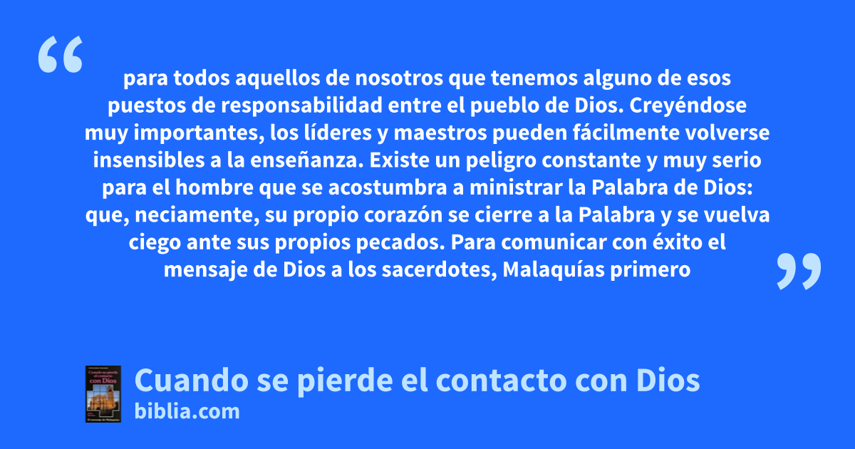 para todos aquellos de nosotros que tenemos alguno de esos puestos de responsabilidad entre el pueblo de Dios. Creyéndose muy importantes, los líderes y maestros pueden fácilmente volverse insensibles a la enseñanza. Existe un peligro constante y muy serio para el hombre que se acostumbra a ministrar la Palabra de Dios: que, neciamente, su propio corazón se cierre a la Palabra y se vuelva ciego ante sus propios pecados. Para comunicar con éxito el mensaje de Dios a los sacerdotes, Malaquías primero