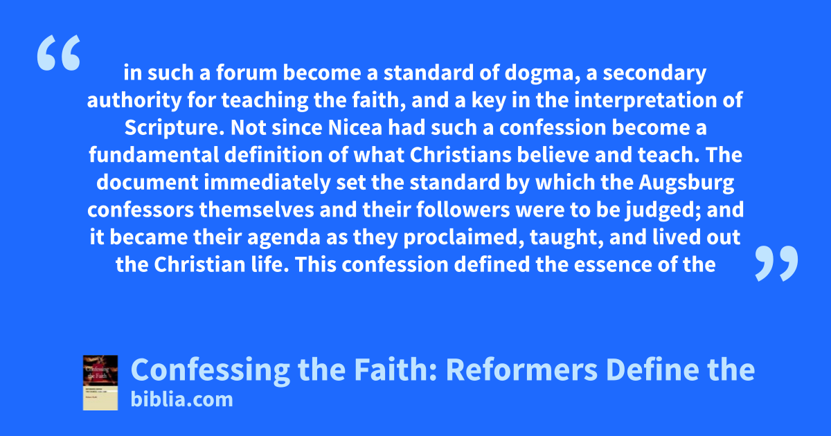 in such a forum become a standard of dogma, a secondary authority for teaching the faith, and a key in the interpretation of Scripture. Not since Nicea had such a confession become a fundamental definition of what Christians believe and teach. The document immediately set the standard by which the Augsburg confessors themselves and their followers were to be judged; and it became their agenda as they proclaimed, taught, and lived out the Christian life. This confession defined the essence of the