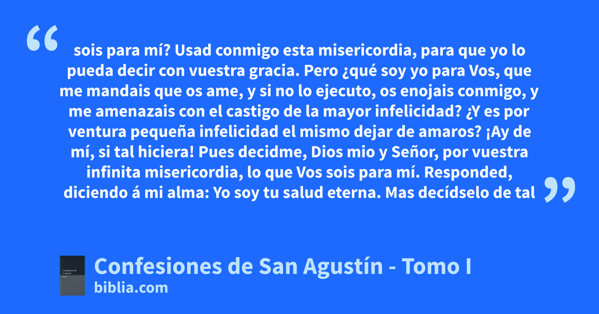 sois para mí? Usad conmigo esta misericordia, para que yo lo pueda decir con vuestra gracia. Pero ¿qué soy yo para Vos, que me mandais que os ame, y si no lo ejecuto, os enojais conmigo, y me amenazais con el castigo de la mayor infelicidad? ¿Y es por ventura pequeña infelicidad el mismo dejar de amaros? ¡Ay de mí, si tal hiciera! Pues decidme, Dios mio y Señor, por vuestra infinita misericordia, lo que Vos sois para mí. Responded, diciendo á mi alma: Yo soy tu salud eterna. Mas decídselo de tal