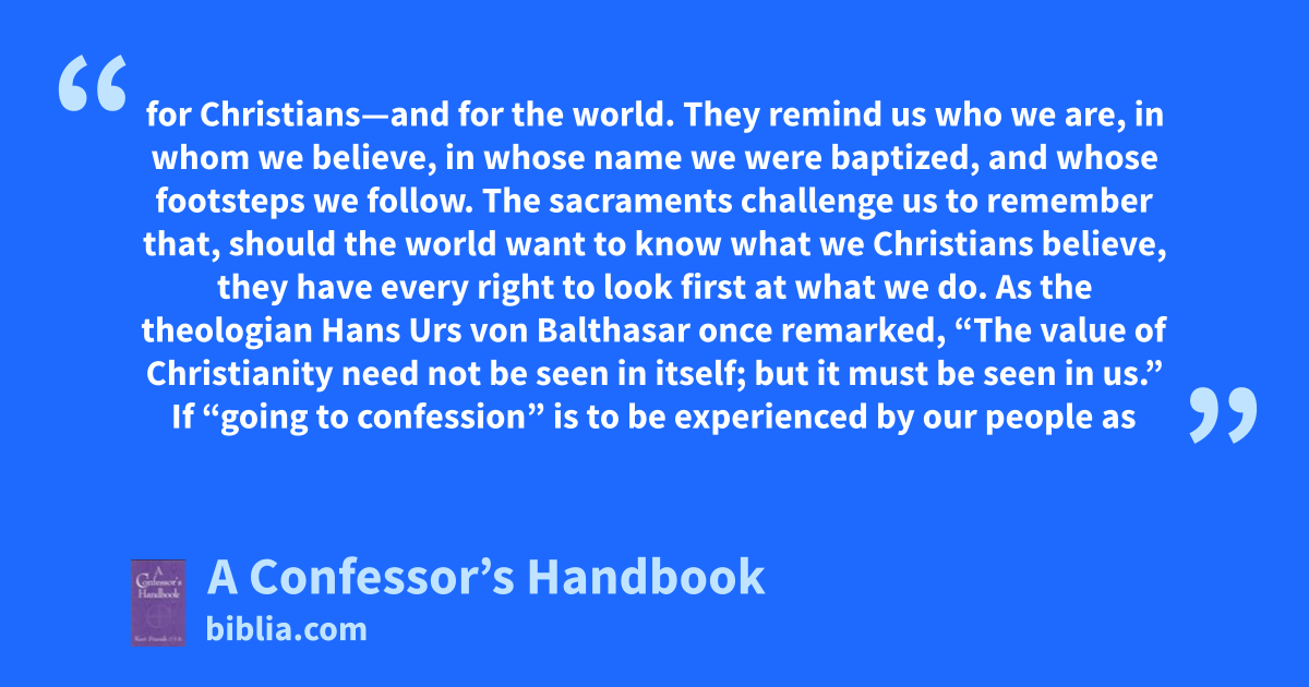 for Christians—and for the world. They remind us who we are, in whom we believe, in whose name we were baptized, and whose footsteps we follow. The sacraments challenge us to remember that, should the world want to know what we Christians believe, they have every right to look first at what we do. As the theologian Hans Urs von Balthasar once remarked, “The value of Christianity need not be seen in itself; but it must be seen in us.” If “going to confession” is to be experienced by our people as