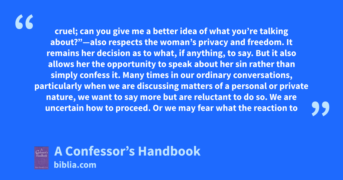 cruel; can you give me a better idea of what you’re talking about?”—also respects the woman’s privacy and freedom. It remains her decision as to what, if anything, to say. But it also allows her the opportunity to speak about her sin rather than simply confess it. Many times in our ordinary conversations, particularly when we are discussing matters of a personal or private nature, we want to say more but are reluctant to do so. We are uncertain how to proceed. Or we may fear what the reaction to
