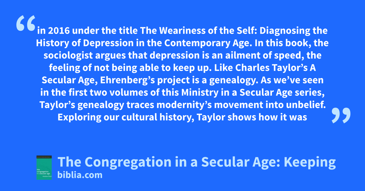 in 2016 under the title The Weariness of the Self: Diagnosing the History of Depression in the Contemporary Age. In this book, the sociologist argues that depression is an ailment of speed, the feeling of not being able to keep up. Like Charles Taylor’s A Secular Age, Ehrenberg’s project is a genealogy. As we’ve seen in the first two volumes of this Ministry in a Secular Age series, Taylor’s genealogy traces modernity’s movement into unbelief. Exploring our cultural history, Taylor shows how it was