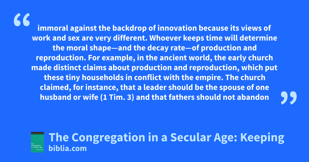 immoral against the backdrop of innovation because its views of work and sex are very different. Whoever keeps time will determine the moral shape—and the decay rate—of production and reproduction. For example, in the ancient world, the early church made distinct claims about production and reproduction, which put these tiny households in conflict with the empire. The church claimed, for instance, that a leader should be the spouse of one husband or wife (1 Tim. 3) and that fathers should not abandon