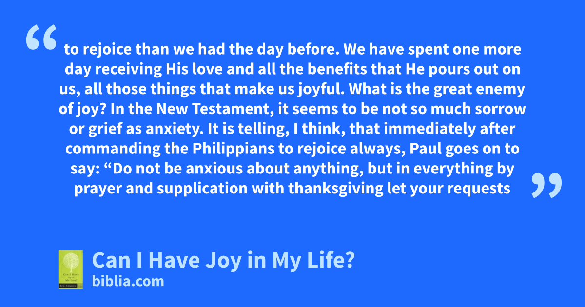 to rejoice than we had the day before. We have spent one more day receiving His love and all the benefits that He pours out on us, all those things that make us joyful. What is the great enemy of joy? In the New Testament, it seems to be not so much sorrow or grief as anxiety. It is telling, I think, that immediately after commanding the Philippians to rejoice always, Paul goes on to say: “Do not be anxious about anything, but in everything by prayer and supplication with thanksgiving let your requests