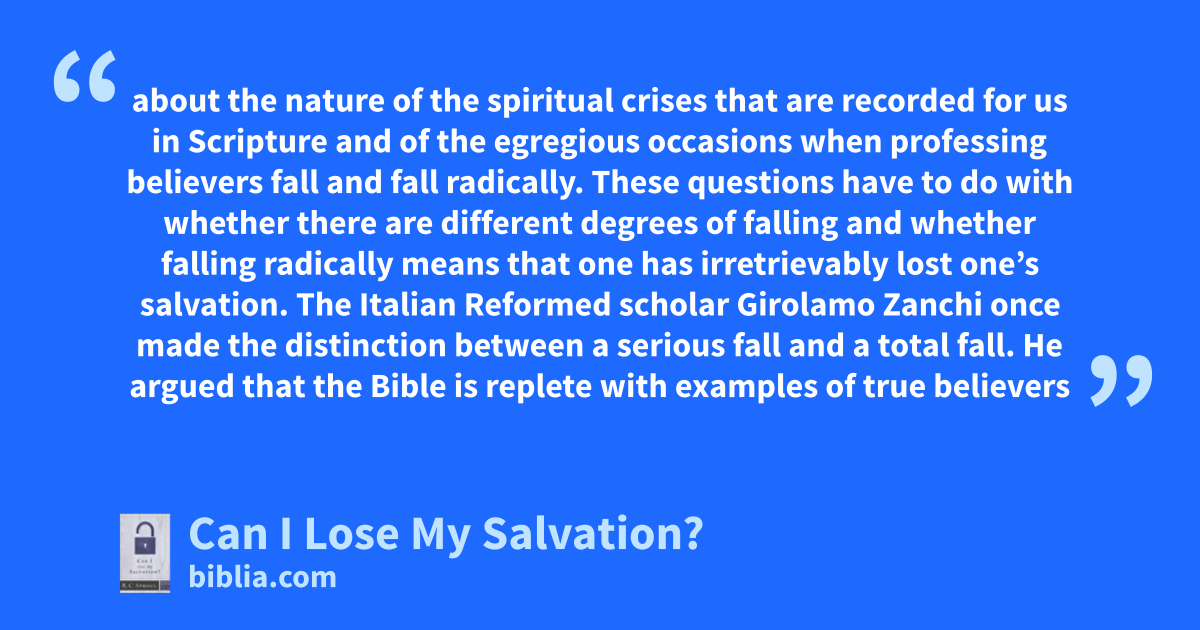 about the nature of the spiritual crises that are recorded for us in Scripture and of the egregious occasions when professing believers fall and fall radically. These questions have to do with whether there are different degrees of falling and whether falling radically means that one has irretrievably lost one’s salvation. The Italian Reformed scholar Girolamo Zanchi once made the distinction between a serious fall and a total fall. He argued that the Bible is replete with examples of true believers