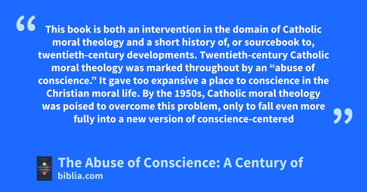 This book is both an intervention in the domain of Catholic moral theology and a short history of, or sourcebook to, twentieth-century developments. Twentieth-century Catholic moral theology was marked throughout by an “abuse of conscience.” It gave too expansive a place to conscience in the Christian moral life. By the 1950s, Catholic moral theology was poised to overcome this problem, only to fall even more fully into a new version of conscience-centered