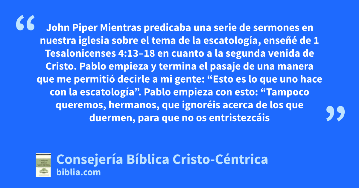 John Piper Mientras predicaba una serie de sermones en nuestra iglesia sobre el tema de la escatología, enseñé de 1 Tesalonicenses 4:13–18 en cuanto a la segunda venida de Cristo. Pablo empieza y termina el pasaje de una manera que me permitió decirle a mi gente: “Esto es lo que uno hace con la escatología”. Pablo empieza con esto: “Tampoco queremos, hermanos, que ignoréis acerca de los que duermen, para que no os entristezcáis