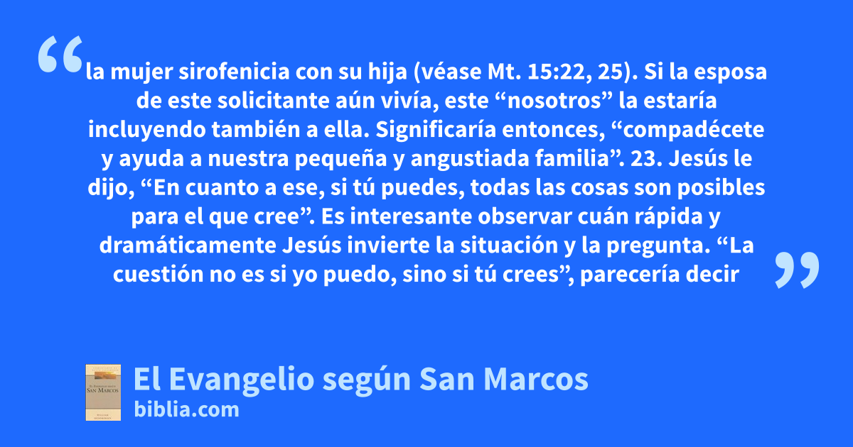 la mujer sirofenicia con su hija (véase Mt. 15:22, 25). Si la esposa de este solicitante aún vivía, este “nosotros” la estaría incluyendo también a ella. Significaría entonces, “compadécete y ayuda a nuestra pequeña y angustiada familia”. 23. Jesús le dijo, “En cuanto a ese, si tú puedes, todas las cosas son posibles para el que cree”. Es interesante observar cuán rápida y dramáticamente Jesús invierte la situación y la pregunta. “La cuestión no es si yo puedo, sino si tú crees”, parecería decir