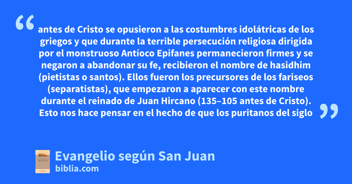 antes de Cristo se opusieron a las costumbres idolátricas de los griegos y que durante la terrible persecución religiosa dirigida por el monstruoso Antíoco Epifanes permanecieron firmes y se negaron a abandonar su fe, recibieron el nombre de hasidhim (pietistas o santos). Ellos fueron los precursores de los fariseos (separatistas), que empezaron a aparecer con este nombre durante el reinado de Juan Hircano (135–105 antes de Cristo). Esto nos hace pensar en el hecho de que los puritanos del siglo