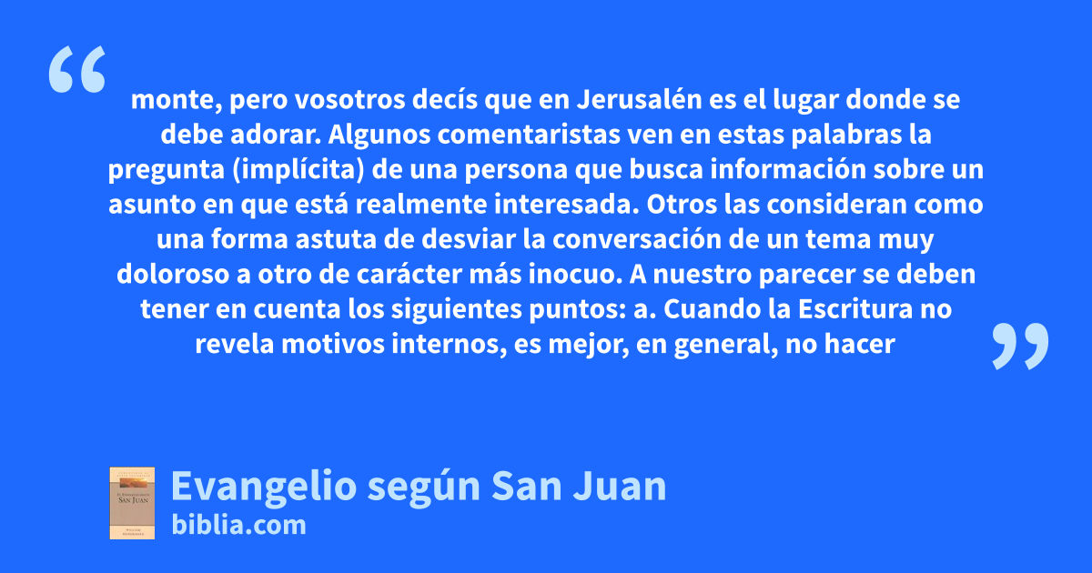 monte, pero vosotros decís que en Jerusalén es el lugar donde se debe adorar. Algunos comentaristas ven en estas palabras la pregunta (implícita) de una persona que busca información sobre un asunto en que está realmente interesada. Otros las consideran como una forma astuta de desviar la conversación de un tema muy doloroso a otro de carácter más inocuo. A nuestro parecer se deben tener en cuenta los siguientes puntos: a. Cuando la Escritura no revela motivos internos, es mejor, en general, no hacer