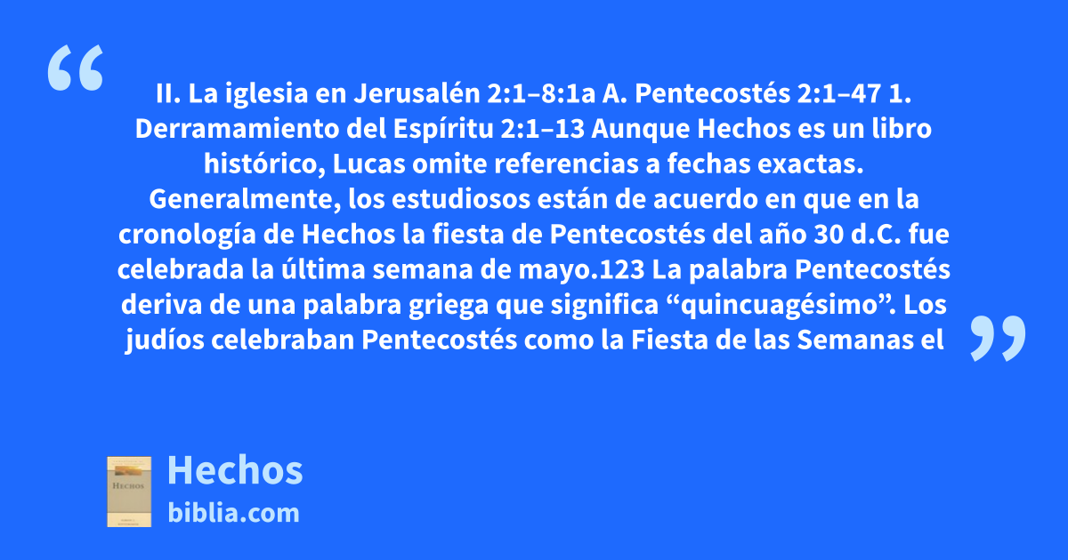II. La iglesia en Jerusalén 2:1–8:1a A. Pentecostés 2:1–47 1. Derramamiento del Espíritu 2:1–13 Aunque Hechos es un libro histórico, Lucas omite referencias a fechas exactas. Generalmente, los estudiosos están de acuerdo en que en la cronología de Hechos la fiesta de Pentecostés del año 30 d.C. fue celebrada la última semana de mayo.123 La palabra Pentecostés deriva de una palabra griega que significa “quincuagésimo”. Los judíos celebraban Pentecostés como la Fiesta de las Semanas el