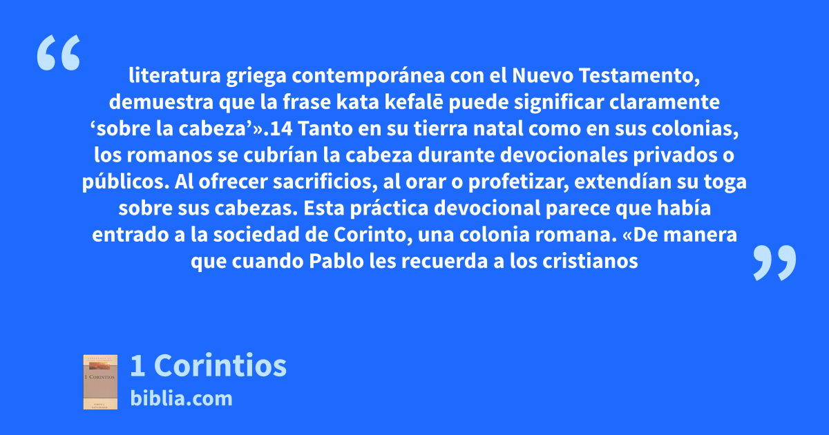 literatura griega contemporánea con el Nuevo Testamento, demuestra que la frase kata kefalē puede significar claramente ‘sobre la cabeza’».14 Tanto en su tierra natal como en sus colonias, los romanos se cubrían la cabeza durante devocionales privados o públicos. Al ofrecer sacrificios, al orar o profetizar, extendían su toga sobre sus cabezas. Esta práctica devocional parece que había entrado a la sociedad de Corinto, una colonia romana. «De manera que cuando Pablo les recuerda a los cristianos