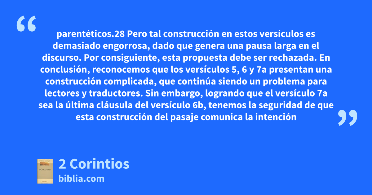 parentéticos.28 Pero tal construcción en estos versículos es demasiado engorrosa, dado que genera una pausa larga en el discurso. Por consiguiente, esta propuesta debe ser rechazada. En conclusión, reconocemos que los versículos 5, 6 y 7a presentan una construcción complicada, que continúa siendo un problema para lectores y traductores. Sin embargo, logrando que el versículo 7a sea la última cláusula del versículo 6b, tenemos la seguridad de que esta construcción del pasaje comunica la intención