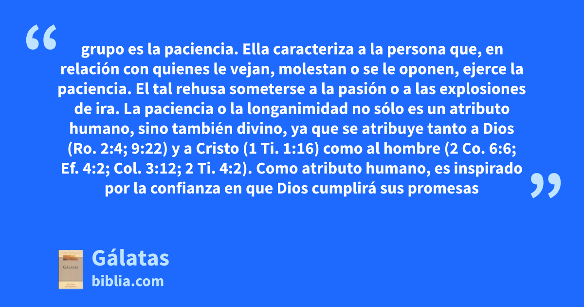 grupo es la paciencia. Ella caracteriza a la persona que, en relación con quienes le vejan, molestan o se le oponen, ejerce la paciencia. El tal rehusa someterse a la pasión o a las explosiones de ira. La paciencia o la longanimidad no sólo es un atributo humano, sino también divino, ya que se atribuye tanto a Dios (Ro. 2:4; 9:22) y a Cristo (1 Ti. 1:16) como al hombre (2 Co. 6:6; Ef. 4:2; Col. 3:12; 2 Ti. 4:2). Como atributo humano, es inspirado por la confianza en que Dios cumplirá sus promesas