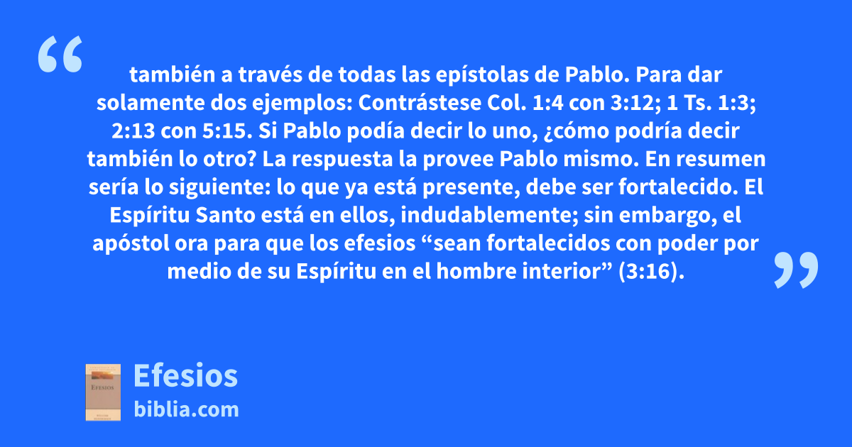 también a través de todas las epístolas de Pablo. Para dar solamente dos ejemplos: Contrástese Col. 1:4 con 3:12; 1 Ts. 1:3; 2:13 con 5:15. Si Pablo podía decir lo uno, ¿cómo podría decir también lo otro? La respuesta la provee Pablo mismo. En resumen sería lo siguiente: lo que ya está presente, debe ser fortalecido. El Espíritu Santo está en ellos, indudablemente; sin embargo, el apóstol ora para que los efesios “sean fortalecidos con poder por medio de su Espíritu en el hombre interior” (3:16).