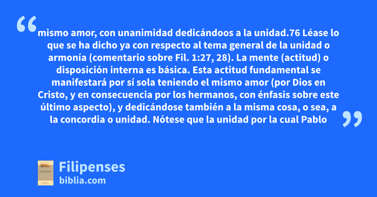 mismo amor, con unanimidad dedicándoos a la unidad.76 Léase lo que se ha dicho ya con respecto al tema general de la unidad o armonía (comentario sobre Fil. 1:27, 28). La mente (actitud) o disposición interna es básica. Esta actitud fundamental se manifestará por sí sola teniendo el mismo amor (por Dios en Cristo, y en consecuencia por los hermanos, con énfasis sobre este último aspecto), y dedicándose también a la misma cosa, o sea, a la concordia o unidad. Nótese que la unidad por la cual Pablo