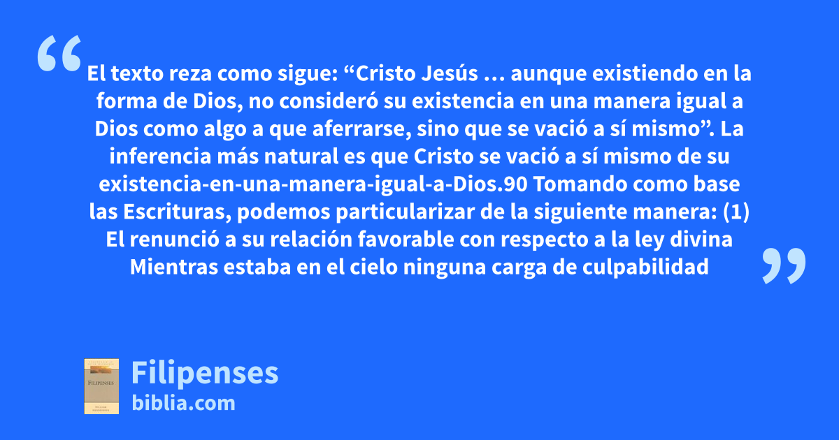El texto reza como sigue: “Cristo Jesús … aunque existiendo en la forma de Dios, no consideró su existencia en una manera igual a Dios como algo a que aferrarse, sino que se vació a sí mismo”. La inferencia más natural es que Cristo se vació a sí mismo de su existencia-en-una-manera-igual-a-Dios.90 Tomando como base las Escrituras, podemos particularizar de la siguiente manera: (1) El renunció a su relación favorable con respecto a la ley divina Mientras estaba en el cielo ninguna carga de culpabilidad