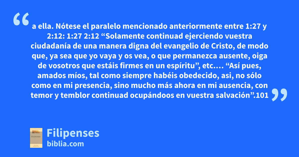 a ella. Nótese el paralelo mencionado anteriormente entre 1:27 y 2:12: 1:27 2:12 “Solamente continuad ejerciendo vuestra ciudadanía de una manera digna del evangelio de Cristo, de modo que, ya sea que yo vaya y os vea, o que permanezca ausente, oiga de vosotros que estáis firmes en un espíritu”, etc.… “Así pues, amados míos, tal como siempre habéis obedecido, asi, no sólo como en mi presencia, sino mucho más ahora en mi ausencia, con temor y temblor continuad ocupándoos en vuestra salvación”.101