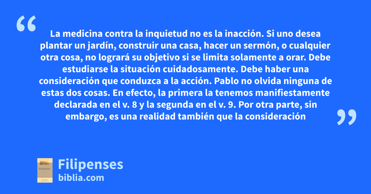 La medicina contra la inquietud no es la inacción. Si uno desea plantar un jardín, construir una casa, hacer un sermón, o cualquier otra cosa, no logrará su objetivo si se limita solamente a orar. Debe estudiarse la situación cuidadosamente. Debe haber una consideración que conduzca a la acción. Pablo no olvida ninguna de estas dos cosas. En efecto, la primera la tenemos manifiestamente declarada en el v. 8 y la segunda en el v. 9. Por otra parte, sin embargo, es una realidad también que la consideración
