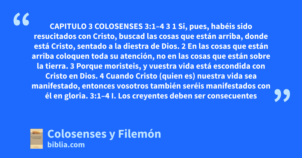 CAPITULO 3 COLOSENSES 3:1–4 3 1 Si, pues, habéis sido resucitados con Cristo, buscad las cosas que están arriba, donde está Cristo, sentado a la diestra de Dios. 2 En las cosas que están arriba coloquen toda su atención, no en las cosas que están sobre la tierra. 3 Porque moristeis, y vuestra vida está escondida con Cristo en Dios. 4 Cuando Cristo (quien es) nuestra vida sea manifestado, entonces vosotros también seréis manifestados con él en gloria. 3:1–4 I. Los creyentes deben ser consecuentes
