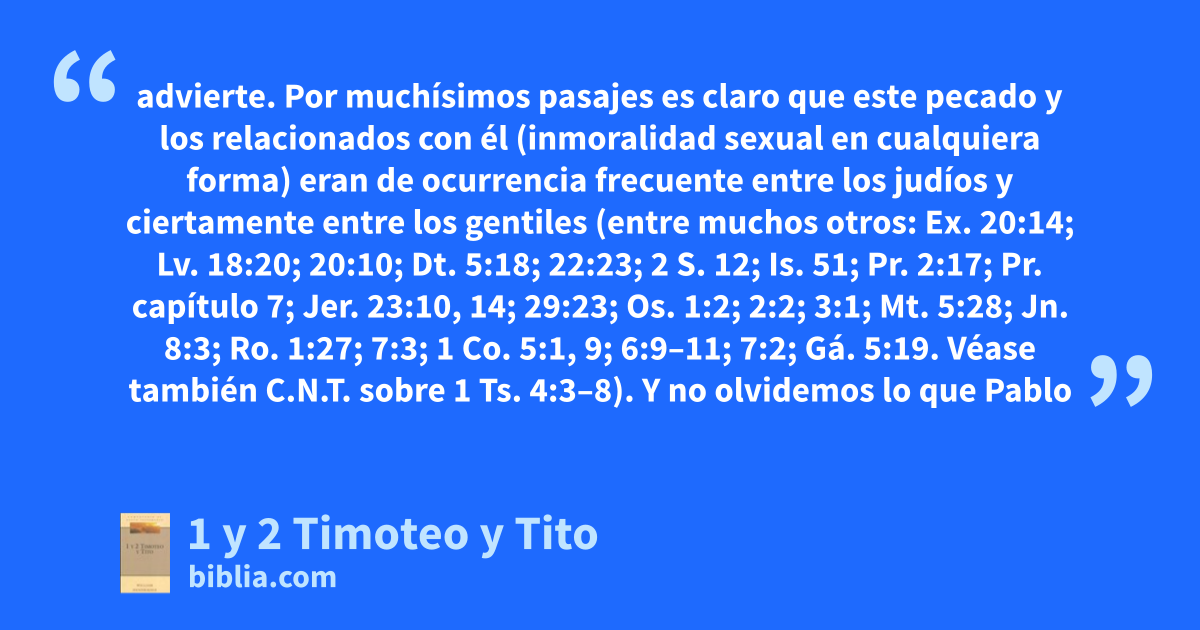 advierte. Por muchísimos pasajes es claro que este pecado y los relacionados con él (inmoralidad sexual en cualquiera forma) eran de ocurrencia frecuente entre los judíos y ciertamente entre los gentiles (entre muchos otros: Ex. 20:14; Lv. 18:20; 20:10; Dt. 5:18; 22:23; 2 S. 12; Is. 51; Pr. 2:17; Pr. capítulo 7; Jer. 23:10, 14; 29:23; Os. 1:2; 2:2; 3:1; Mt. 5:28; Jn. 8:3; Ro. 1:27; 7:3; 1 Co. 5:1, 9; 6:9–11; 7:2; Gá. 5:19. Véase también C.N.T. sobre 1 Ts. 4:3–8). Y no olvidemos lo que Pablo