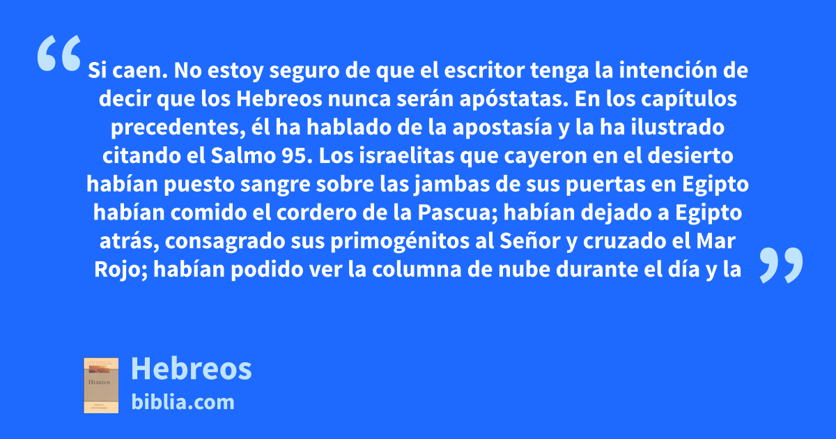 Si caen. No estoy seguro de que el escritor tenga la intención de decir que los Hebreos nunca serán apóstatas. En los capítulos precedentes, él ha hablado de la apostasía y la ha ilustrado citando el Salmo 95. Los israelitas que cayeron en el desierto habían puesto sangre sobre las jambas de sus puertas en Egipto habían comido el cordero de la Pascua; habían dejado a Egipto atrás, consagrado sus primogénitos al Señor y cruzado el Mar Rojo; habían podido ver la columna de nube durante el día y la