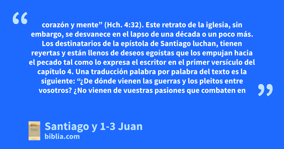 corazón y mente” (Hch. 4:32). Este retrato de la iglesia, sin embargo, se desvanece en el lapso de una década o un poco más. Los destinatarios de la epístola de Santiago luchan, tienen reyertas y están llenos de deseos egoístas que los empujan hacia el pecado tal como lo expresa el escritor en el primer versículo del capítulo 4. Una traducción palabra por palabra del texto es la siguiente: “¿De dónde vienen las guerras y los pleitos entre vosotros? ¿No vienen de vuestras pasiones que combaten en