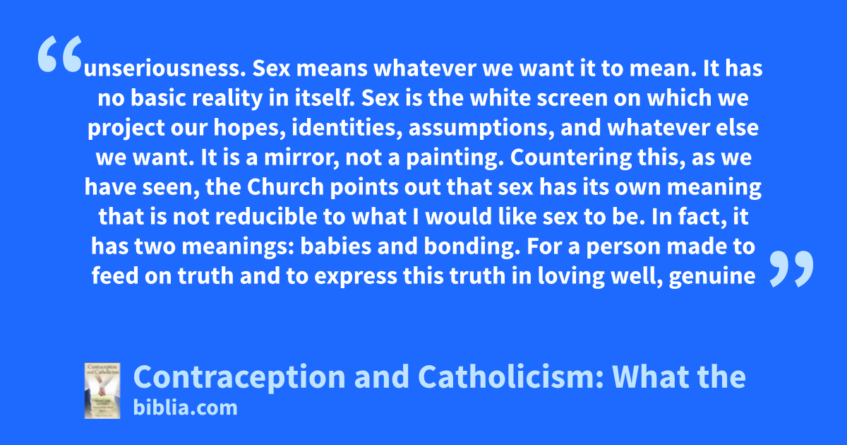 unseriousness. Sex means whatever we want it to mean. It has no basic reality in itself. Sex is the white screen on which we project our hopes, identities, assumptions, and whatever else we want. It is a mirror, not a painting. Countering this, as we have seen, the Church points out that sex has its own meaning that is not reducible to what I would like sex to be. In fact, it has two meanings: babies and bonding. For a person made to feed on truth and to express this truth in loving well, genuine