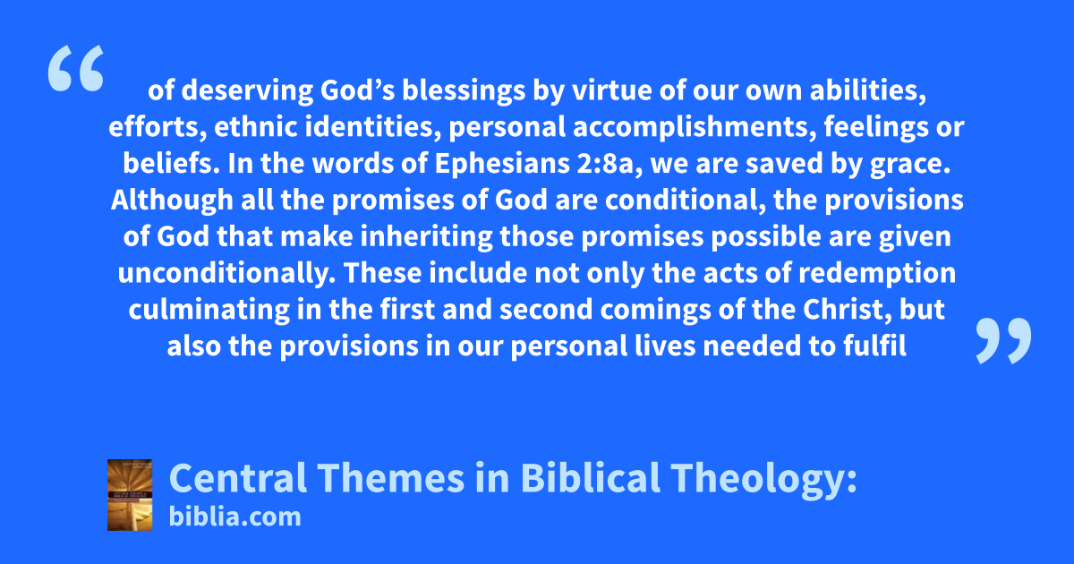 of deserving God’s blessings by virtue of our own abilities, efforts, ethnic identities, personal accomplishments, feelings or beliefs. In the words of Ephesians 2:8a, we are saved by grace. Although all the promises of God are conditional, the provisions of God that make inheriting those promises possible are given unconditionally. These include not only the acts of redemption culminating in the first and second comings of the Christ, but also the provisions in our personal lives needed to fulfil