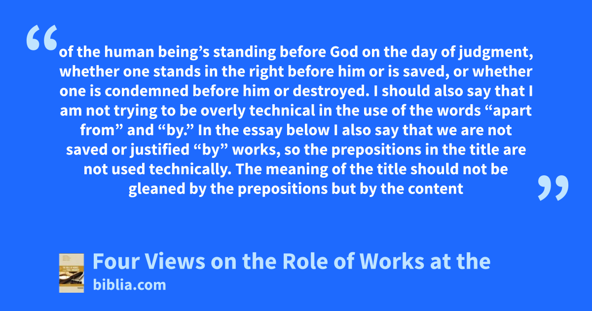 of the human being’s standing before God on the day of judgment, whether one stands in the right before him or is saved, or whether one is condemned before him or destroyed. I should also say that I am not trying to be overly technical in the use of the words “apart from” and “by.” In the essay below I also say that we are not saved or justified “by” works, so the prepositions in the title are not used technically. The meaning of the title should not be gleaned by the prepositions but by the content